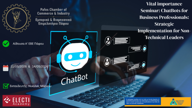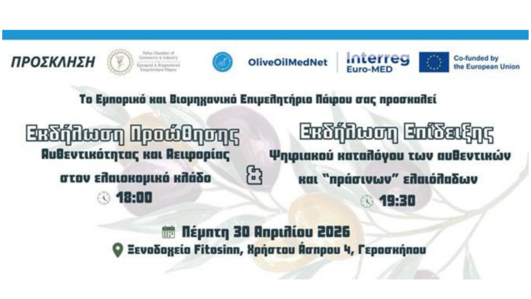 Το Εμπορικό και Βιομηχανικό Επιμελητήριο Πάφου, ως Εταίρος του έργου CROSS-COASTAL-NET, προσκαλεί τις ενδιαφερόμενες επιχειρήσεις – μέλη του που δραστηριοποιούνται στον ευρύτερο τουριστικό κλάδο (πχ τουριστικά γραφεία, εστιατόρια, ενοικιάσεις αυτοκινήτων κλπ), να εγγραφούν ηλεκτρονικά στην πλατφόρμα μέσω του παρακάτω συνδέσμου: