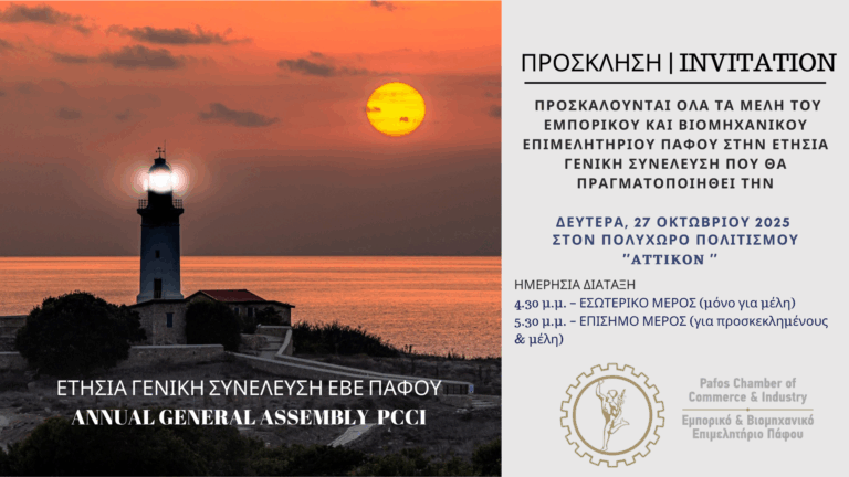 Το Εμπορικό και Βιομηχανικό Επιμελητήριο Πάφου προσκαλεί όλα τα Μέλη του στην ΕΤΗΣΙΑ ΓΕΝΙΚΗ ΣΥΝΕΛΕΥΣΗ που θα πραγματοποιηθεί την Δευτέρα, 27η Οκτωβρίου 2025 στον πολυχώρο πολιτισμού ‘AΤΤΙΚΟΝ’.